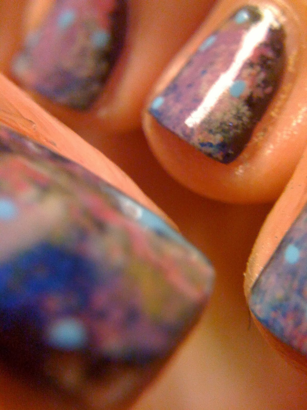 This is two coats of Sally Hansen fuzzy coat in "all yarned up" over a random light blue (sorry I can't remember what color I used). All yarned up is a combo or yellow, orange, and blue small bar glitters in a clear base. I've noticed a couple other brands releasing these. Barry M has a line of confetti polishes they are practically the same exact collection. Nails inc have a feather effect line that is also very similar, and China glaze has a on the horizon set that also has these tiny bar glitters but in slightly different shades.